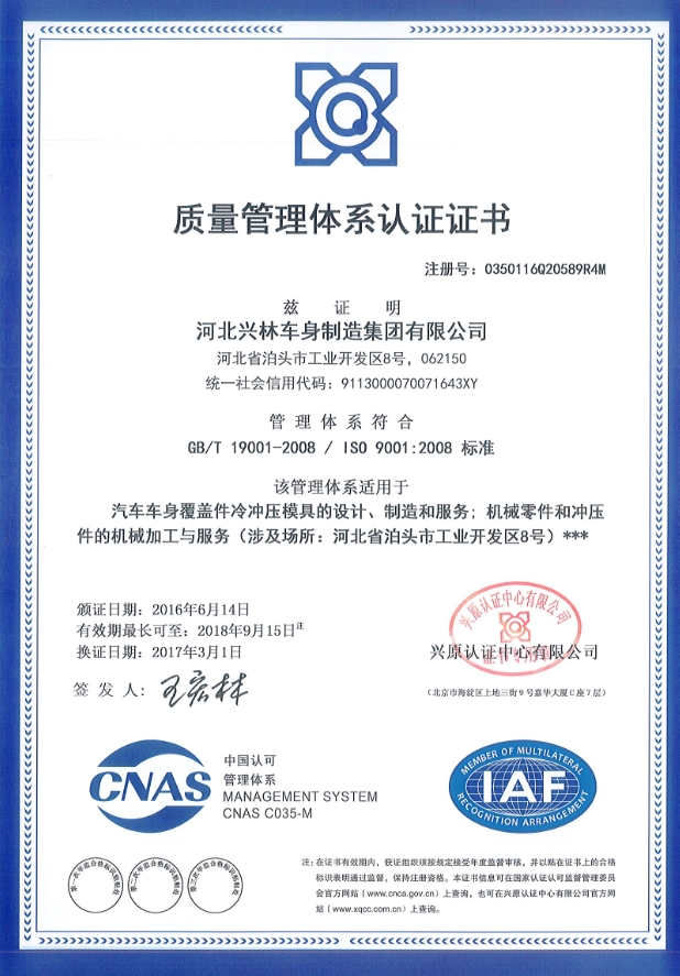 2017年3月1日,興林集團(tuán)取得了ISO9001質(zhì)量管理體系擴(kuò)大范圍認(rèn)證,這是興林集團(tuán)在產(chǎn)品質(zhì)量體系認(rèn)證上又一次巨大突破。