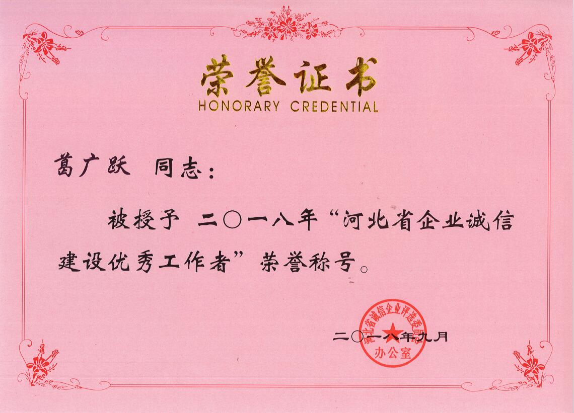 我司憑借良好的誠信建設(shè)和社會信譽,以誠信提升業(yè)務(wù)水平,進行誠信經(jīng)營管理,以質(zhì)量求生存,積極加強誠信管理。榮獲“河北省誠信企業(yè)”榮譽稱號,總經(jīng)理葛廣躍先生榮獲“河北省誠信企業(yè)建設(shè)優(yōu)秀工作者”稱號。